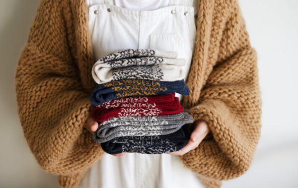 膨らみがあるウールをしっかり編み上げた、たいへん暖かいジャガードソックスです。