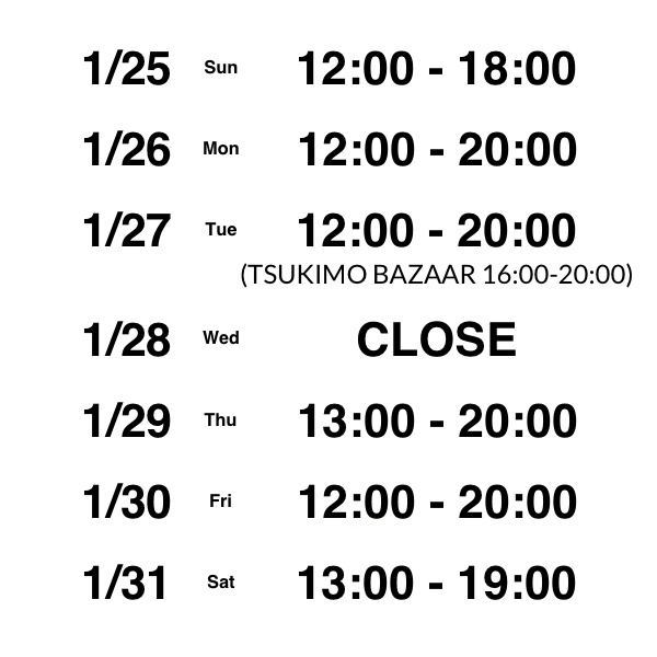 1月25日〜1月31日 営業案内 2026/1/25 |お知らせ ご利用いただきまして、誠にありがとうございます。 1/25〜1/31の営業案内になります。 1/27(火) 16:00〜ツキモバザールのパン販売があります。 1/29(木)・1/31(土)は、13時の開店になります。 ご来店をお待ちしております。 Tag:お知らせ « Previous