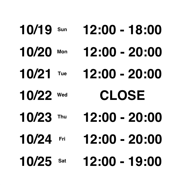 10月19日〜10月25日 営業案内 2025/10/19 |お知らせ ご利用いただきまして、誠にありがとうございます。 10/19〜10/25の営業案内になります。 ご来店をお待ちしております。 Tag:お知らせ « Previous