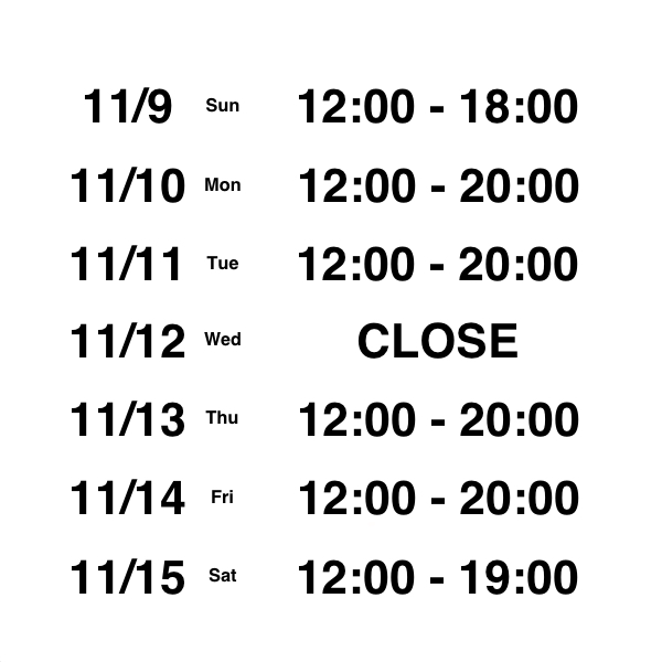 11月9日〜11月15日 営業案内 2025/11/9 |お知らせ ご利用いただきまして、誠にありがとうございます。 11/9〜11/15の営業案内になります。 ご来店をお待ちしております。 Tag:お知らせ « Previous