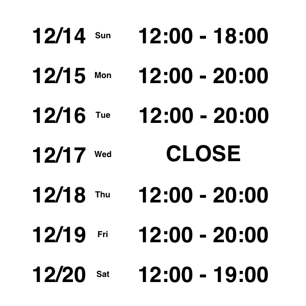 12月14日〜12月20日 営業案内 2025/12/14 |お知らせ ご利用いただきまして、誠にありがとうございます。 12/14〜12/20の営業案内になります。 ご来店をお待ちしております。 Tag:お知らせ « Previous Next »