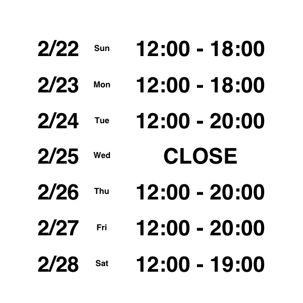 2月22日〜2月28日 営業案内 2026/2/21 |お知らせ ご利用いただきまして、誠にありがとうございます。 2/22〜2/28の営業案内になります。 3/1(日)までSALE開催中です。 ご来店をお待ちしております。 « Previous