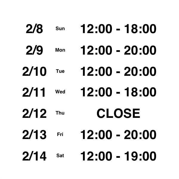 2月8日〜2月14日 営業案内 2026/2/8 |お知らせ ご利用いただきまして、誠にありがとうございます。 2/8〜2/14の営業案内になります。 オンラインショップ、店頭にて、冬物SALE開催中です。 ご来店をお待ちしております。 Tag:お知らせ « Previous