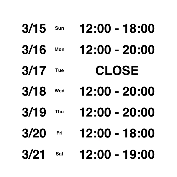 3月15日〜3月21日 営業案内 2026/3/15 |お知らせ *リニューアル作業により、3/16 10:00から、Online Storeを休止したします。* ご利用いただきまして、誠にありがとうございます。 3/15〜3/21の営業案内になります。 今週は火曜日がお休み、水曜日が営業になります。 水曜日がお休みで、普段実店舗に行くことができないお客様、ぜひお待ちしております! Tag:お知らせ « Previous